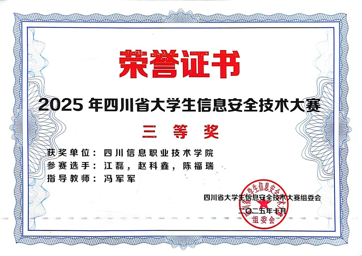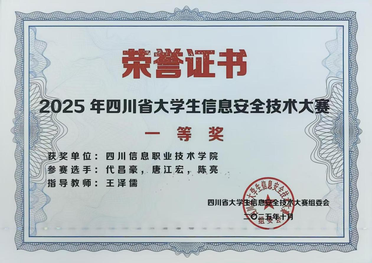 10月26日,由四川省教育厅主办,中共四川省委网信办和四川省公安厅指导的2025年四川省大学生信息安全技术大赛在成都信息工程大学双流新型产业学院圆满落下帷幕。今年会网络与通信学院王泽儒老师指导的川信一队、冯军军老师指导的川信二队,分别荣获大赛一等奖和三等奖。